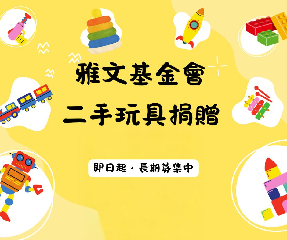 我們正在募集二手玩具,您捐贈的玩具,將全數提供給雅文基金會服務之家庭,雅文基金會致力於支持聽損兒童的語言發展與教育,透過專業聽語服務與家庭支援,幫助孩子自信溝通、融入社會。