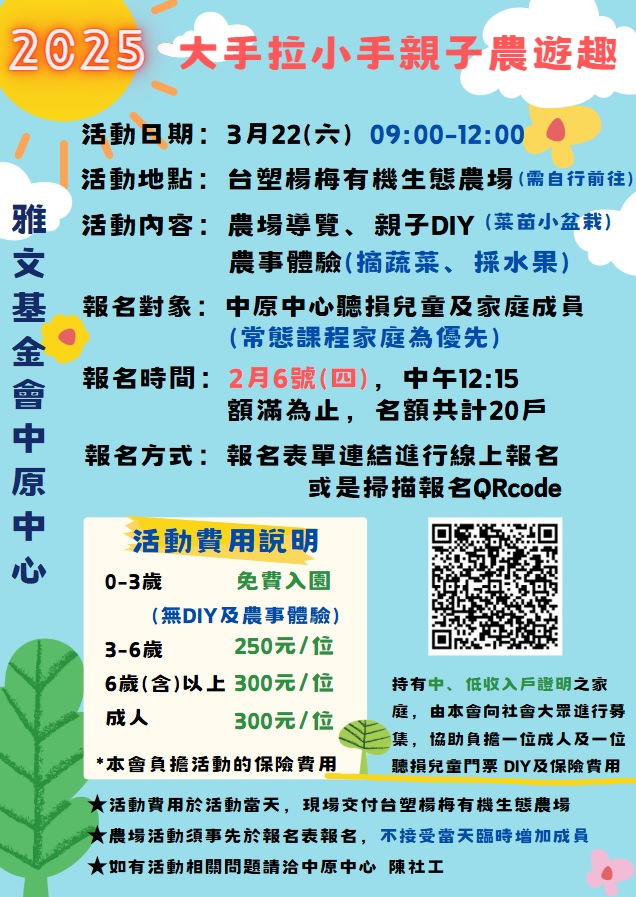 透過農場體驗,摘蔬菜、水果,親子DIY活動,從中培養親子的情感交流,增加孩子的生活經驗,更同時讓聽損兒增加同儕互動經驗,培養溝通技巧及社交能力,誠摯的邀請您們一同參與!
