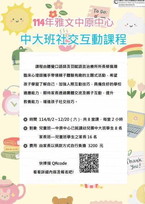 活動地點:雅文基金會中原中心2號教室及全人教育村南棟207教室(桃園市中壢區中北路200號)
