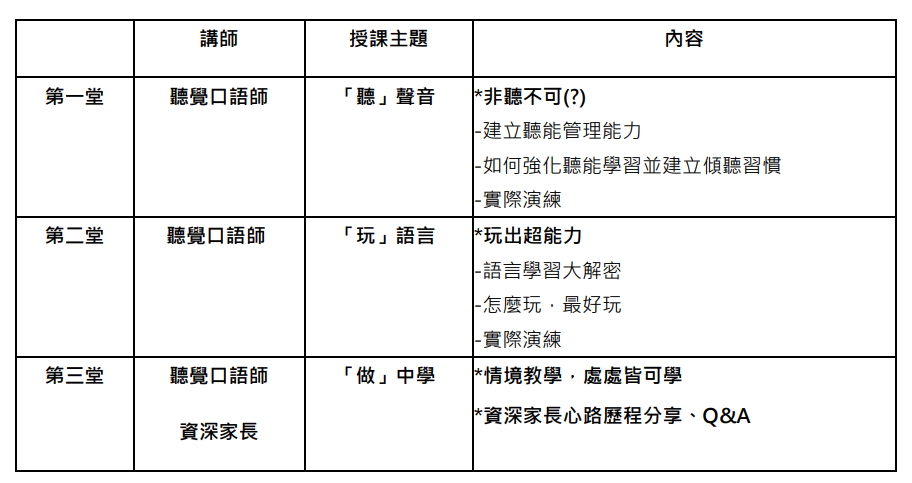 我們將透過「聽聲音」、「玩語言」、「做中學」三場次的課程,帶領家長將聽覺口語法融入在生活情境中,讓聽語訓練可以更快上手之外,也可以和其他參與家庭有更多教學、育兒經驗交流,成為療育路上的好夥伴,還在等什麼,名額有限,立刻手刀報名吧!