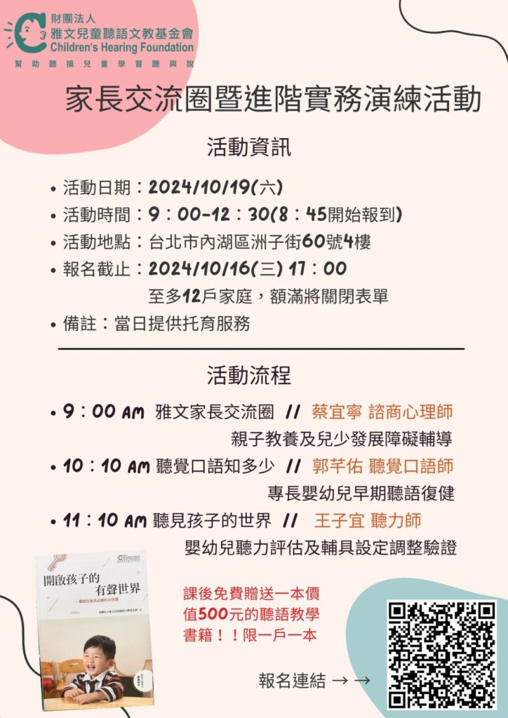 雅文基金會深深了解,當孩子確診聽損時,無疑對您與家人的心情產生了莫大衝擊,對於現在及未來所可能面臨到的挑戰充滿焦慮與不安,因此雅文基金會特別規劃「家長交流圈暨進階實務演練」課程,期待透過諮商心理師、聽力師與聽覺口語師的面對面實務教學及引導訓練,帶領您一同開啟孩子的聽、說大門!