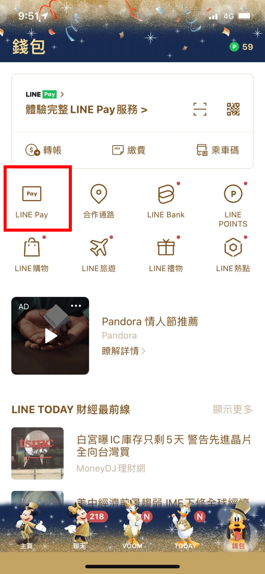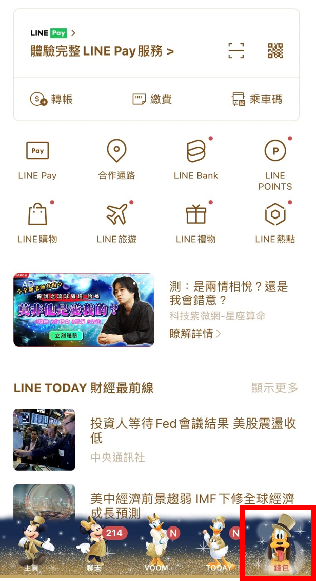 1. 進入LINE,點選右下方「錢包」,見下圖紅框處