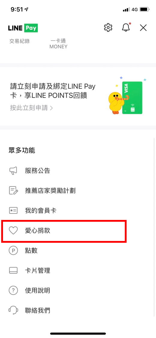 2. 點選「LINE Pay」→ 「愛心捐款」