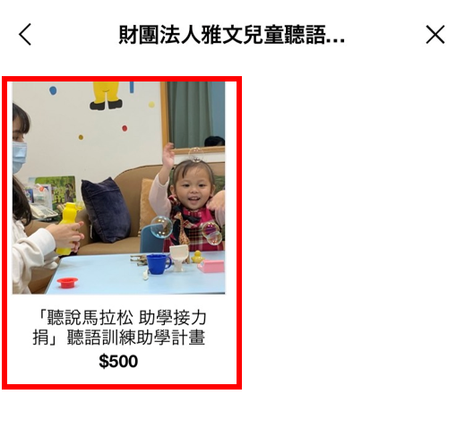 3. 搜尋「雅文基金會」,即可點選捐款方案,捐款支持聽損兒學習聽與說