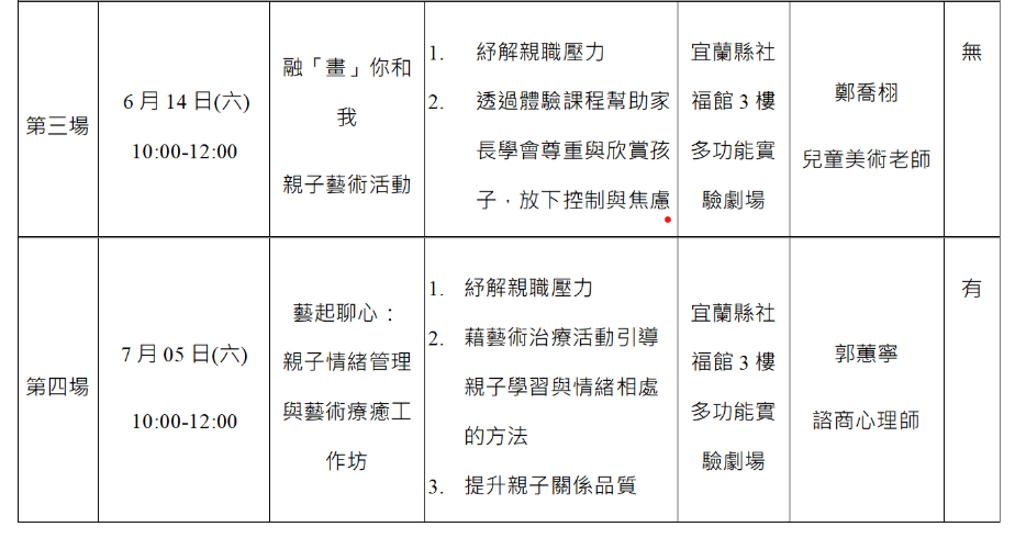 今年度共規劃4場次家長團體活動,包括:由本會聽損兒組成的雅文小劇場演出節目、社區共融運動會、藝術治療與親子紓壓活動等,歡迎宜蘭中心家庭踴躍報名,在活動中享受美好親子時光、互相交流育兒心得!