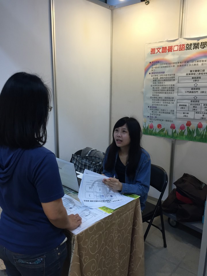 中原大學於2015年5月6日(三)舉辦全校性「就業學程暨跨領域學程博覽會」,本會有幸受邀參與活動。當天活動透過聽損個案成功學習聽與說的故事分享以及闖關活動,吸引了近20名學生至攤位了解,除了長期密切合作的特教系學生之外,更有教育所、醫工系、應華系等學生,體現有更多非聽語直接的相關科系也認識了本會。