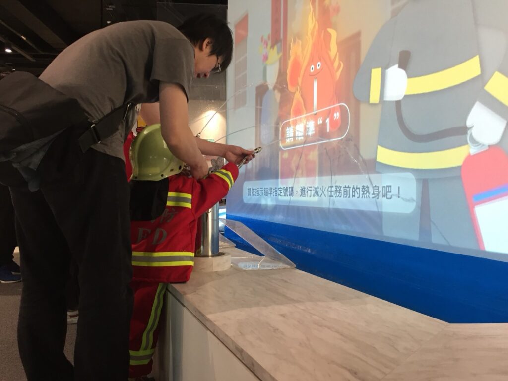接下來到了眾所期待的小小消防員Cosplay,孩子們穿上消防衣化身英勇的消防員,參與滅火與各項救援任務,大家都玩得不亦樂乎!在熱鬧且吵雜的環境中,家長們也自然地將課堂所學的聽說策略運用在與孩子的互動中,耐心引導孩子並給予溫柔鼓勵、讚美,真得要給他們一個大大的讚!