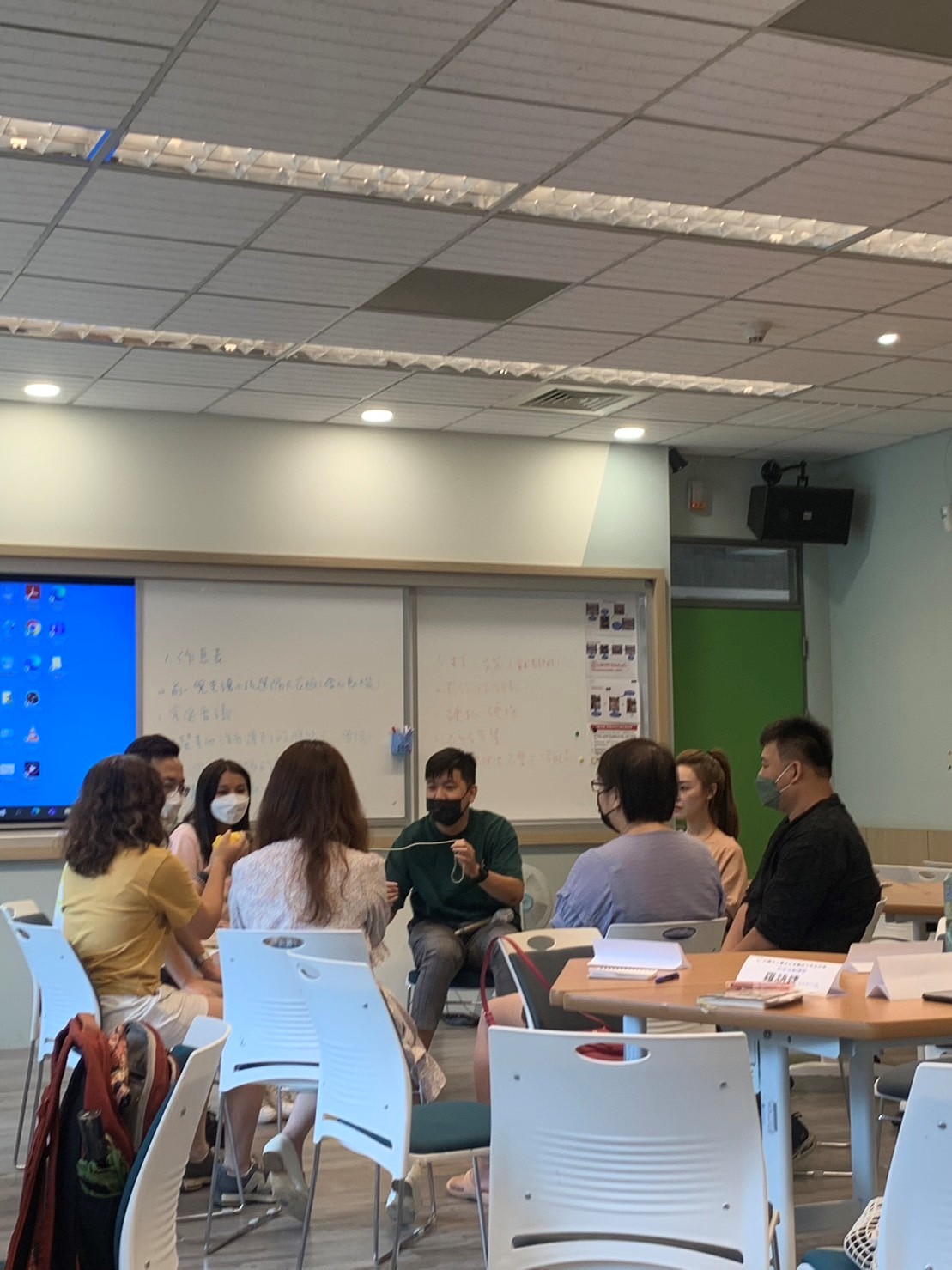 最後一個活動,心理師請大家圍成一圈,彼此分享這三個月課程裡面經歷的、學到的或最喜歡的內容。並於分享後將毛線球丟給下一位家長,由心理師分享帶家長團體的感覺,