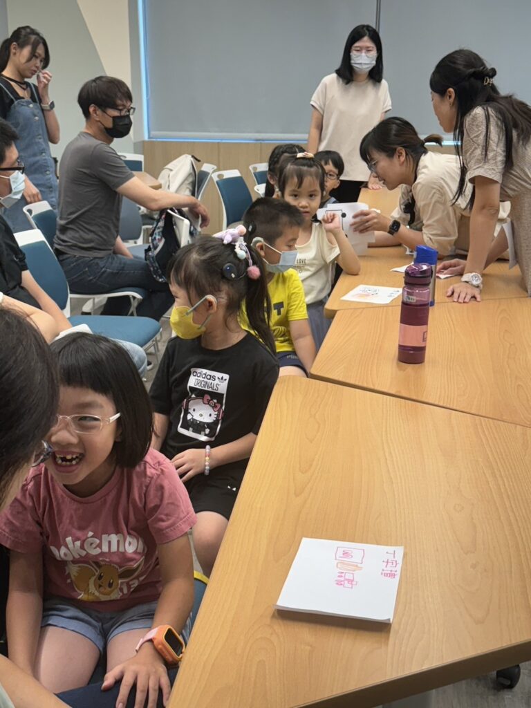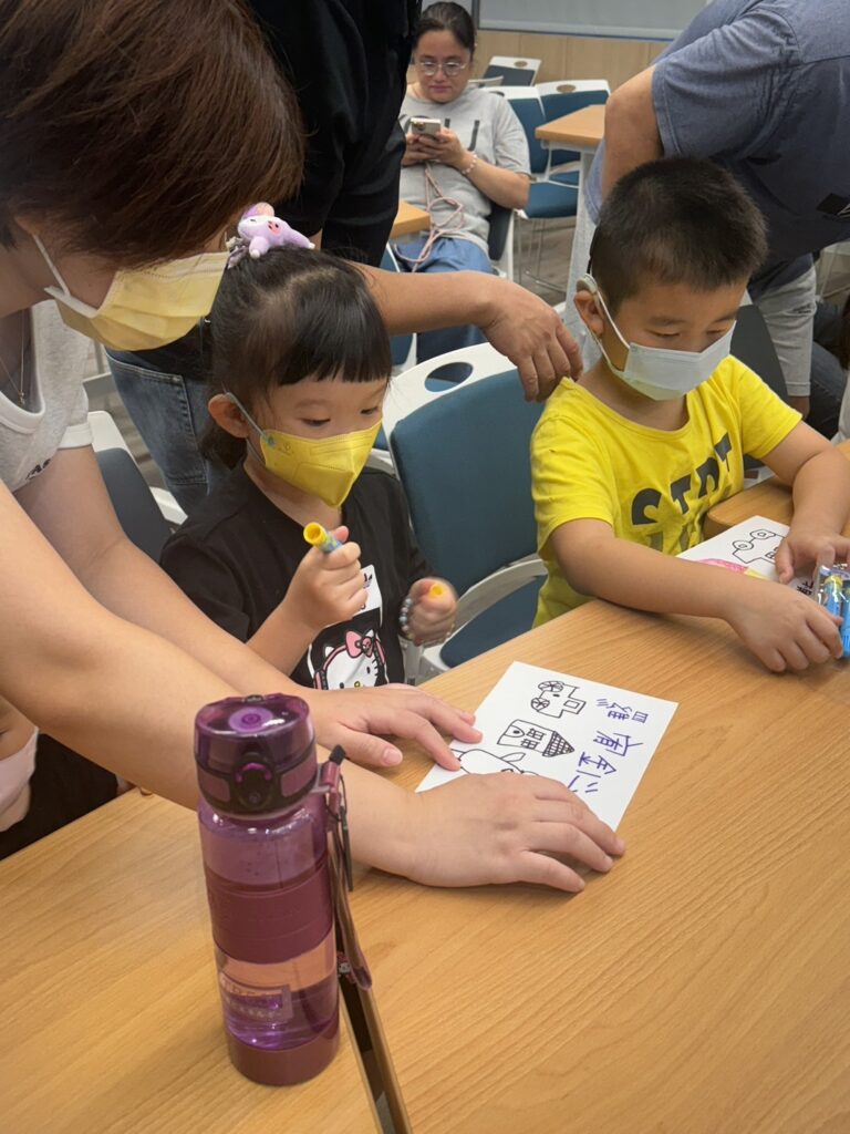 為讓孩子們適應團體,治療師們於首堂課程先安排了親子活動,讓孩子在家長的陪同下練習適應新的團體。第一個活動先讓大家利用白紙、彩色筆簡單製作自己的名牌,並上台自我介紹。接著老師利用繪本:魔法印記,傳達孩子就算在沒有父母的陪伴,也可以帶著爸爸媽媽愛的印記,勇敢地完成任務。也透過遊戲接棒的方式,讓小朋友傳遞愛的印記,接觸新朋友,並預告接下來第二堂的課別課程。