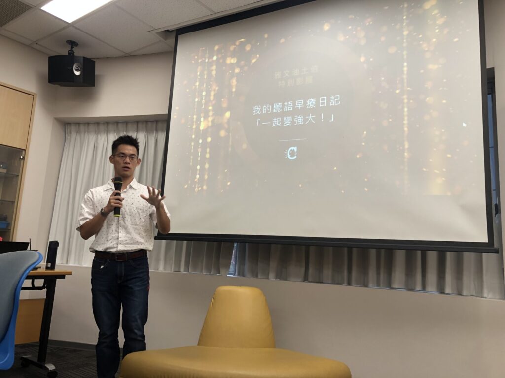 在「我的聽語早療日記:一起變強大」影片放映會當天,有位聽損大朋友,沉著的擔任活動主持人,毫不膽怯的拿著麥克風向眾人侃侃而談,也真摯的回應每位家長、孩子的想法。當日出席者,紛紛給予高度評價,他——是徐代明。