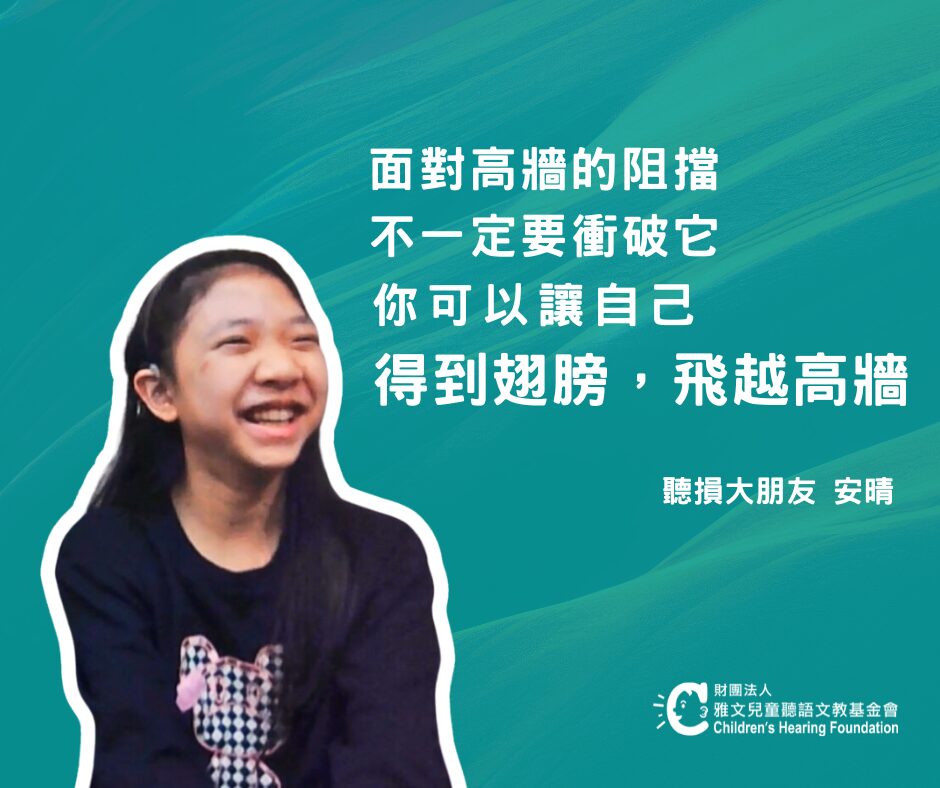 而對於其他的聽損朋友及其家長,安晴則想說:聽力損失並不是你人生的障礙。就像是如果有顆蛋被擋在高牆前, 因為蛋很脆弱,所以你不是要讓蛋去撞高牆,而是必須孵化它,讓它長出翅膀,飛過高牆。