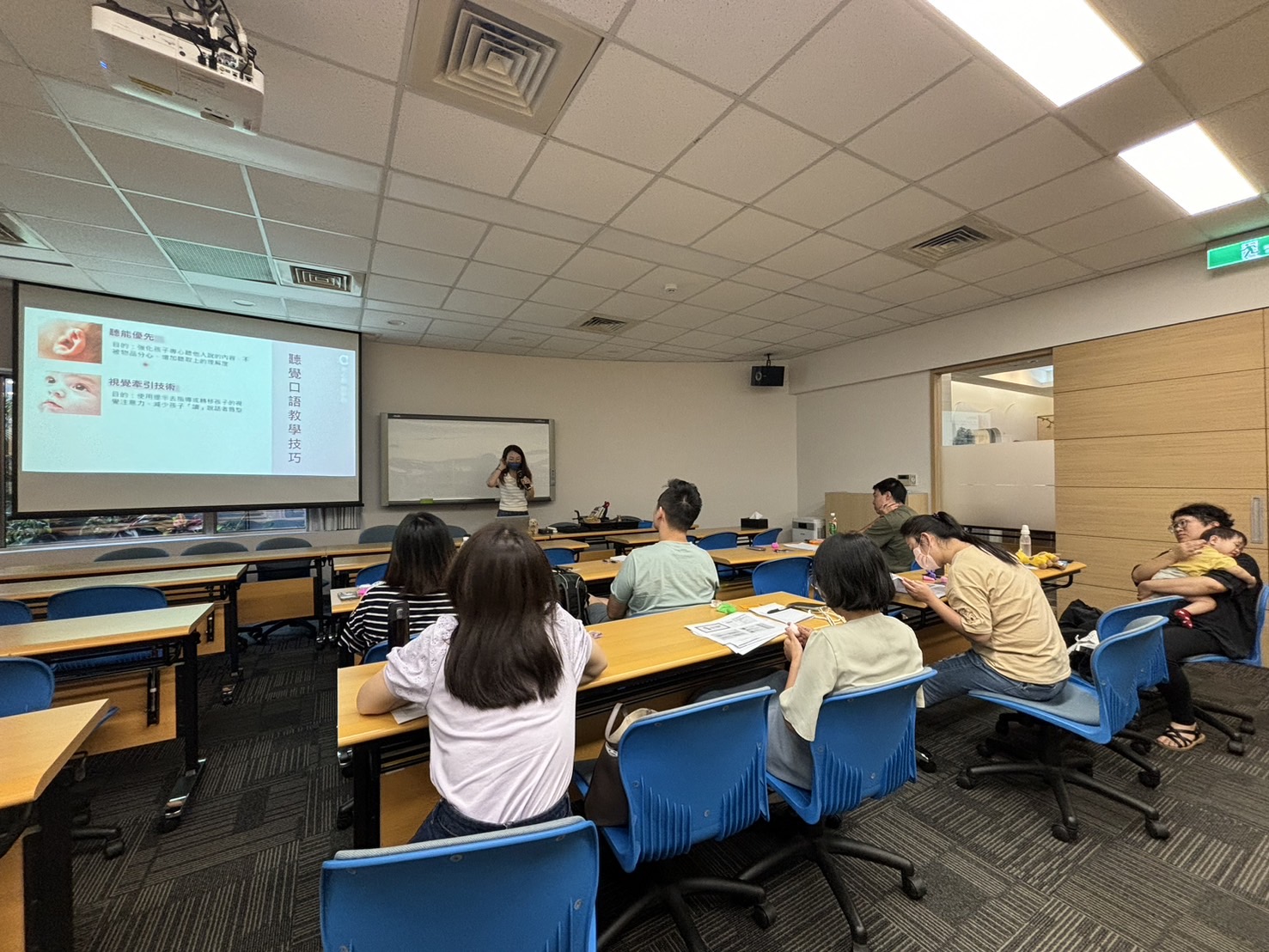 第二堂課為「開啟有聲世界~聽覺口語我來教」,由本會林郁沂老師主講,一開始講授早期療育的重要性及聽覺口語法的特色等內容,帶家長認識孩子的語言發展、聽覺發展歷程,並分享與孩子的對話互動方式,提供給家長更多日常互動的方法。