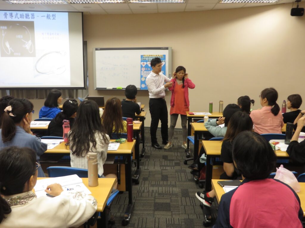 上午時段由本會聽力師張晏銘講授「聽力疾病及聽覺輔具認識與照護」課程,聽力師以淺顯易懂的方式介紹了造成聽力損失的原因、聽力損失的類型、聽覺輔具功能及FM系統介紹及操作,課程中並讓各校教師體驗使用骨導助聽器、FM無線調頻系統所聽到的聲音,還有現場實作,幫助聽損兒戴上耳模和助聽器,透過親身體驗和實際操作讓與會教師能更加熟悉輔具的操作。