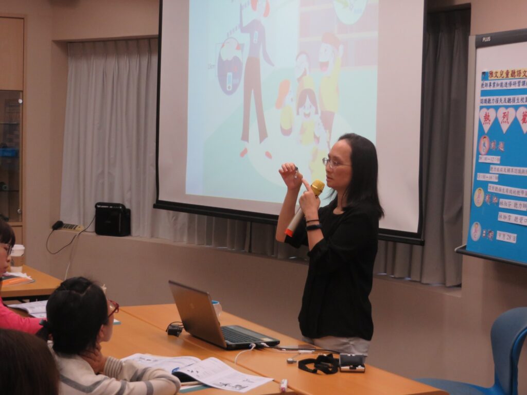 上午時段,由本會林淑芬聽力師講授「聽力疾病及聽覺輔具認識與照護」的課程,聽力師以淺顯易懂的方式介紹了聽力損失的成因、聽力檢查的類型及目的、如何判讀聽力圖,以及不同類型聽覺輔具的介紹與操作,課程中也讓各校教師實際練習幫助聽損兒戴上耳模和助聽器,透過實際操作讓與會教師能更加熟悉輔具的操作。