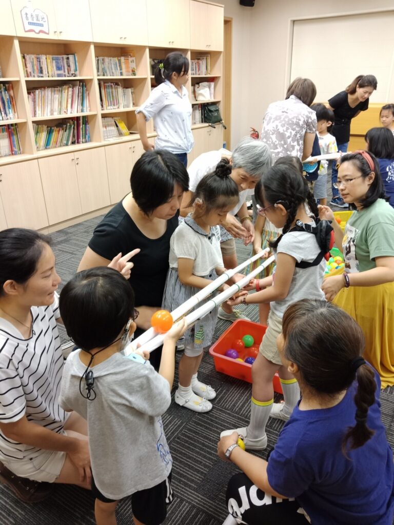 在簡單的暖身活動後,闖關活動正式開始!第一關是紙棍溜滑梯,老師將孩子們分為兩組,要使用四根紙棍搭建溜滑梯,合作將球從溜滑梯滾到盒子裡。一開始,兩組的孩子都還沒有掌握到滾球技巧,四根紙棍也搭建的歪七扭八,球一滾就掉到地上,兩個孩子也差點放棄,但在家長的陪伴與鼓勵下,孩子又回到自己的組別繼續挑戰。有的家長在過程中說:「很好,手都沒有動喔!快要成功了」,另外也有媽媽緊張的說:「手要扶好,再高一點,對!手舉高了,很棒喔!」,許多家長在引導孩子的時後,都加入了鼓勵具體事蹟的讚美。一段時間後,兩組的孩子們都掌握到滾球技巧與合作默契了,最後快速的將球都滾進了盒子裡,孩子與家長們看見成功之後,都眉開眼笑了。