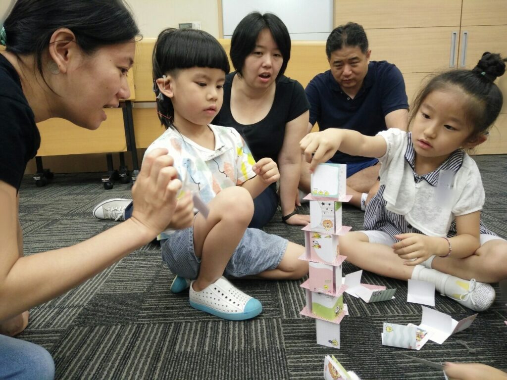 而其他組孩子們則有不同的情形:有一組自動發展出分工合作的模式,一人遞牌,一人疊牌,合作無間;另一組則是以輪流搭建方式來互動,你疊一張牌,我疊一張牌,一起完成紙牌大樓。在整個活動過程中,老師也不斷引導著家長,要提供正向的鼓勵之外,也要適時的用口頭提出建議與方法,教導孩子與他人互動時的合宜技巧,更不能動手幫助孩子搭建紙牌大樓,為的是要讓孩子透過家長的陪伴引導下,可以親自的完成任務與解決困難,增進孩子在人際互動的經驗。