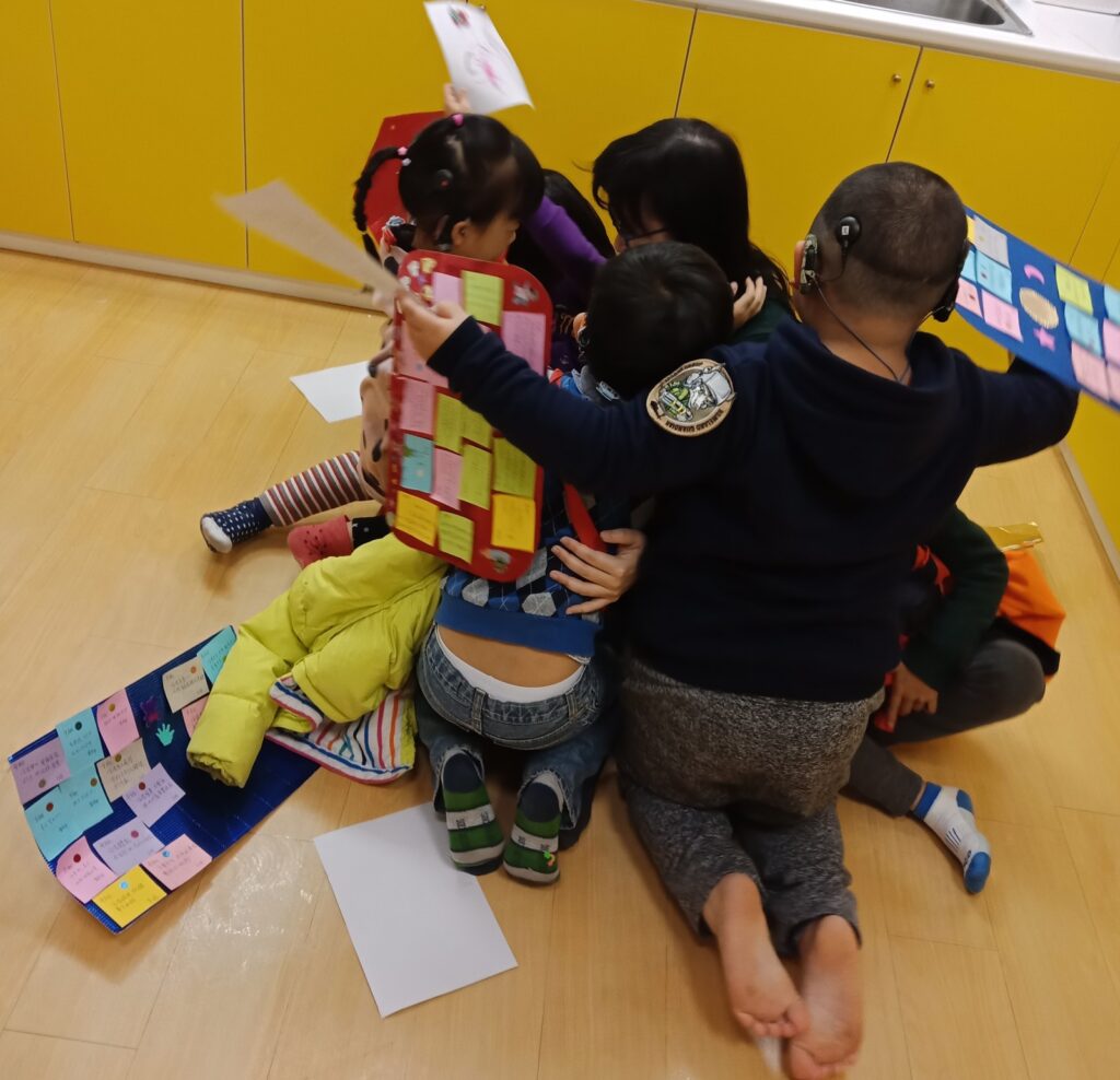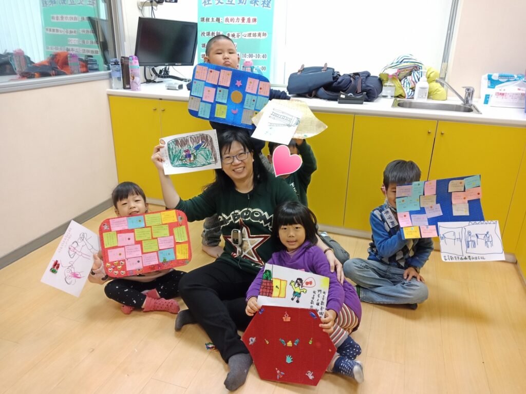 課程一開始,老師將課前幾週,向家長與基金會老師蒐集到的每位孩子的優點卡片,發給每位孩子,也唸給孩子們聽,孩子們在拿到卡片後,都無比開心。隨後也著手用這些優點小卡製作了屬於自己的盾牌。大家把優點卡貼在盾牌上,也挑選喜歡的貼紙在上頭裝飾。孩子們做好盾牌後,一個個拿著盾牌,炯炯有神看著他人,像是強而有力的小戰士呢!原來這些優點小卡與盾牌,讓孩子大大提升了內在的力量,表情神情都更加自信。另外下課前,老師也讓孩子們製作一張屬於爸媽的感謝獎狀,要給爸媽一個小小驚喜。獎狀中有各種感謝,有人寫下:「最喜歡爸爸媽媽幫我拿糖果,謝謝你們」,也有人畫下洗澡的畫面,想要告訴爸媽:「最喜歡爸爸媽媽陪我一起洗澡,謝謝你們」,還有人畫出睡覺的幸福時光,感謝爸媽的陪伴。感謝爸媽的事物都不同,但其中卻有一樣是不變的-親子間無限的愛。