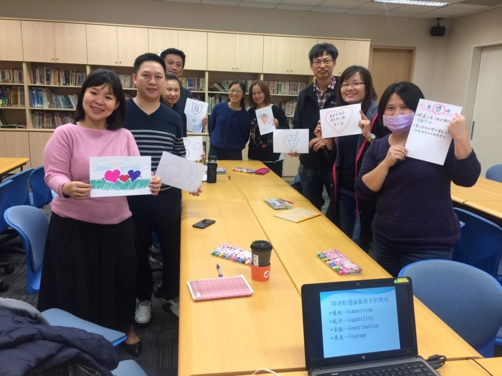 而另一頭的家長班級裡,老師透過阿德勒的4C原則和家長溫故知新,共同討論與回顧所有課程,也請家長回憶,在這三個月的過程中,嘗試了哪些引導技巧,老師請家長將這些好的改變,製作成一張自己的獎狀,希望家長時常看見自己的亮點。家長思考了一會兒後,紛紛低頭開始動手。完成後,首先分享獎狀的是寬寬媽媽,她沒有缺席任何一場的課程,給自己頒了全勤獎,其他家長則是覺得為了孩子變得更有耐心、更努力、有幹勁。雖然有的家長覺得自己在教養中,還需要再加強,但是老師提醒,父母也是學習者,邊學邊教,要懂得相信自己,時時建立自我與對孩子的信心,一起互助互信,才能一同克服未來困難,與孩子一同成長與學習。