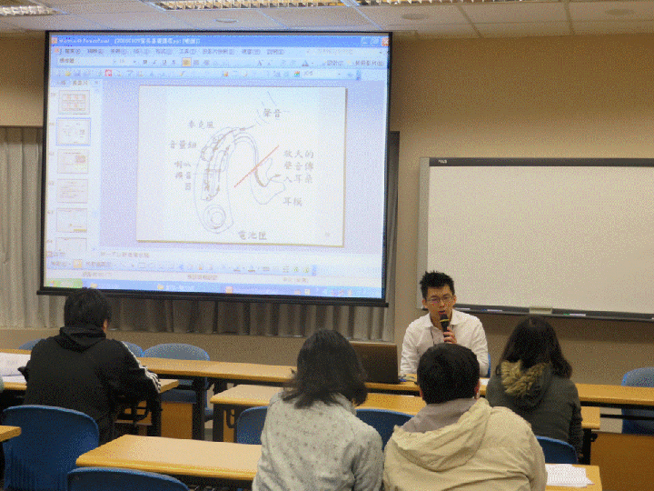 第二堂課程為《聽能管理》課程,由本會聽力師─張晏銘主講。聽力師將艱澀的聽力專業知識清楚整理,以平易近人的陳述方式,讓家長們認識聽損的原因、了解聽損的類型、以及聽損對孩子在語言、認知發展、人際互動以及自信心等方面的影響。同時,輔以淺顯易懂的實例說明,教導家長認識聽力報告與助聽輔具,並澄清家長對聽損的相關誤解,按部就班地協助家長了解聽能管理的重要性。課程後,也利用部分時間讓大家提問,再進一步依個別狀況詳細說明,使較為焦慮的家長在取得建議之後,因瞭解具體的處理方向而較為安心。