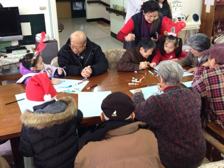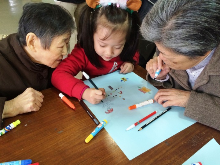 除了用歌聲陪伴外,聖誕小天使們分組與長輩們一同作畫,分工協力完成聖誕節主題的作品。過程中,小朋友們盡心描邊,長輩們協助上色,還一同討論畫中的顏色、大小及形狀等,小朋友個個伶牙俐齒、活潑又可愛的分享作畫的經驗,也不忘用心聆聽長輩們精采故事,用歡聲笑語贏得爺爺奶奶們的歡心,陪伴他們提前度過溫馨的聖誕節!