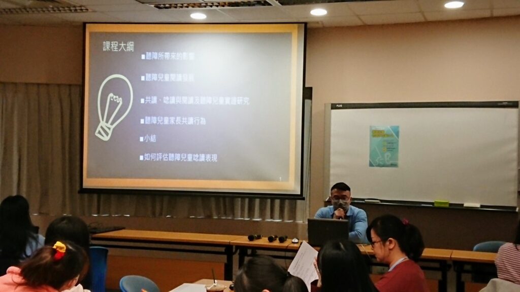 此次工作坊中,首先登場的暖身課程為「聽損兒童相關研究」,研究員詹益智介紹了與聽損兒童「共讀、唸讀與閱讀」相關的背景知識,幫助學員能更輕鬆銜接後續的實作課程。