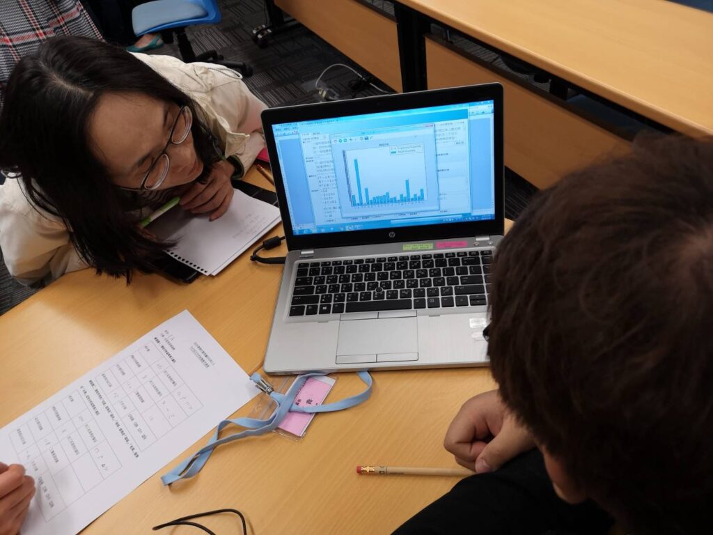 與會者一起操作中文短文分析軟體。根據分析結果,可以透過長條圖了解短文中聲母頻率的分布情形。