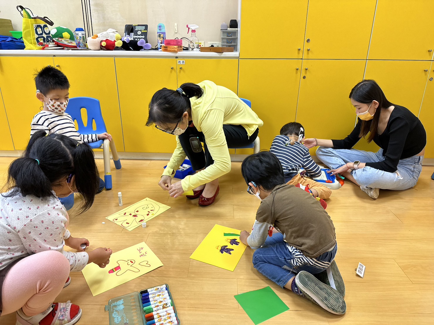 此兩場課程過程中,老師讓孩子們透過樂器的演奏時間,訓練孩子們在團體中的輪流與等待,課程最後也以作畫及剪貼勞作的方式,用各種顏色與素材,來使孩子將情緒感受用具體用作品表達出來。