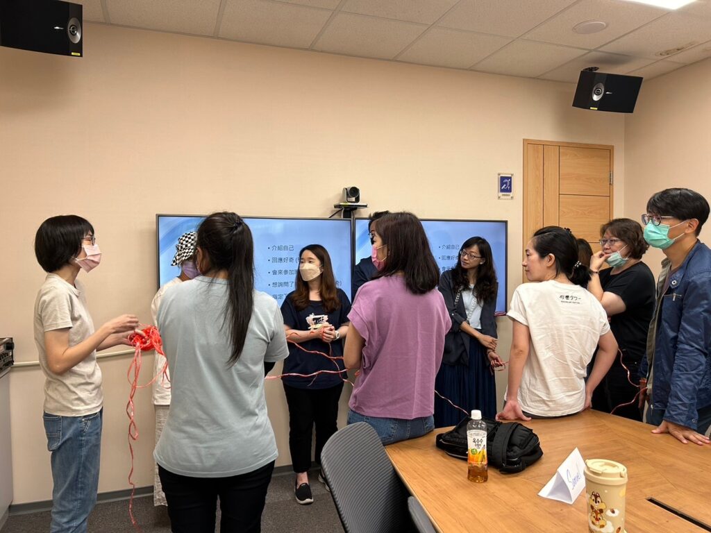 家長班第一堂課主要是促進團體成員間的認識與熟悉 ,老師先帶領每位家長製作自己的名牌,依序分享自身的工作、家庭狀況,並分享育兒的趣事與困擾,促進家長彼此之間相互交流,也讓老師了解每位家長的期望及家庭獨特的需求。接著運用人際蜘蛛網的活動,透過傳球給指定的成員,幫助成員之間的認識與連結,也在最後全員完成活動、形成網絡時,宣導保密網的團體規範。