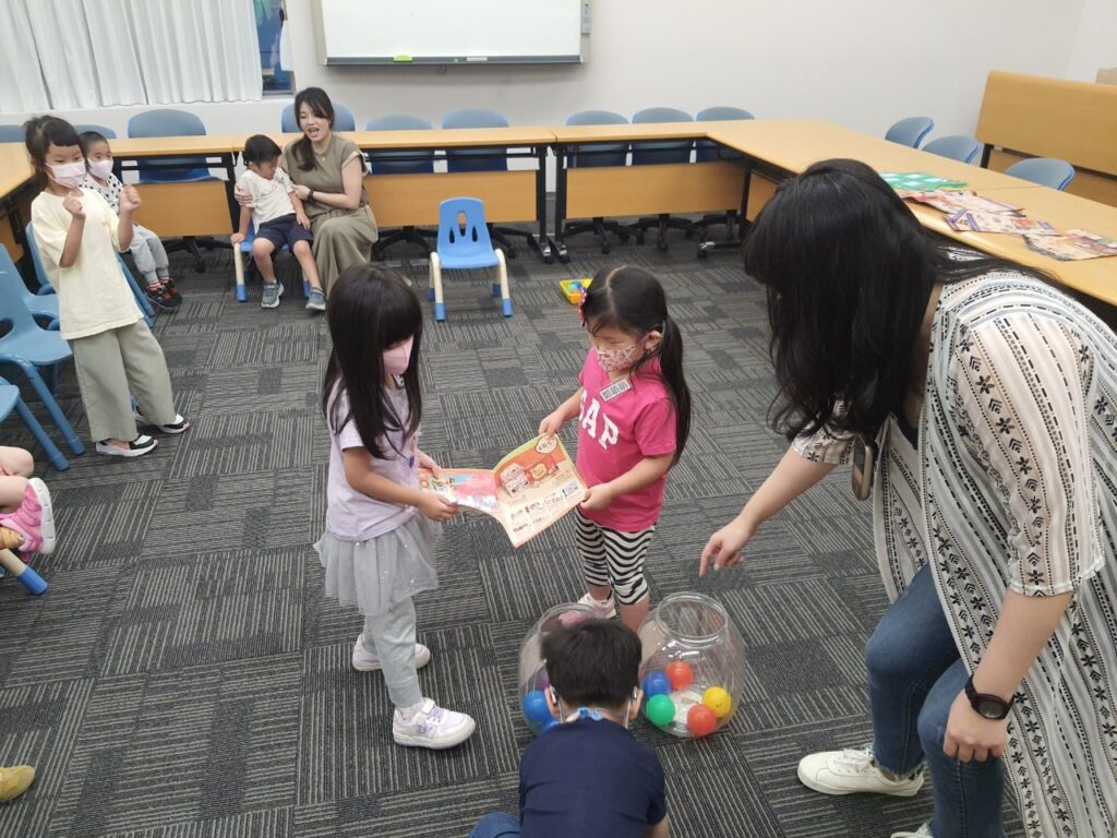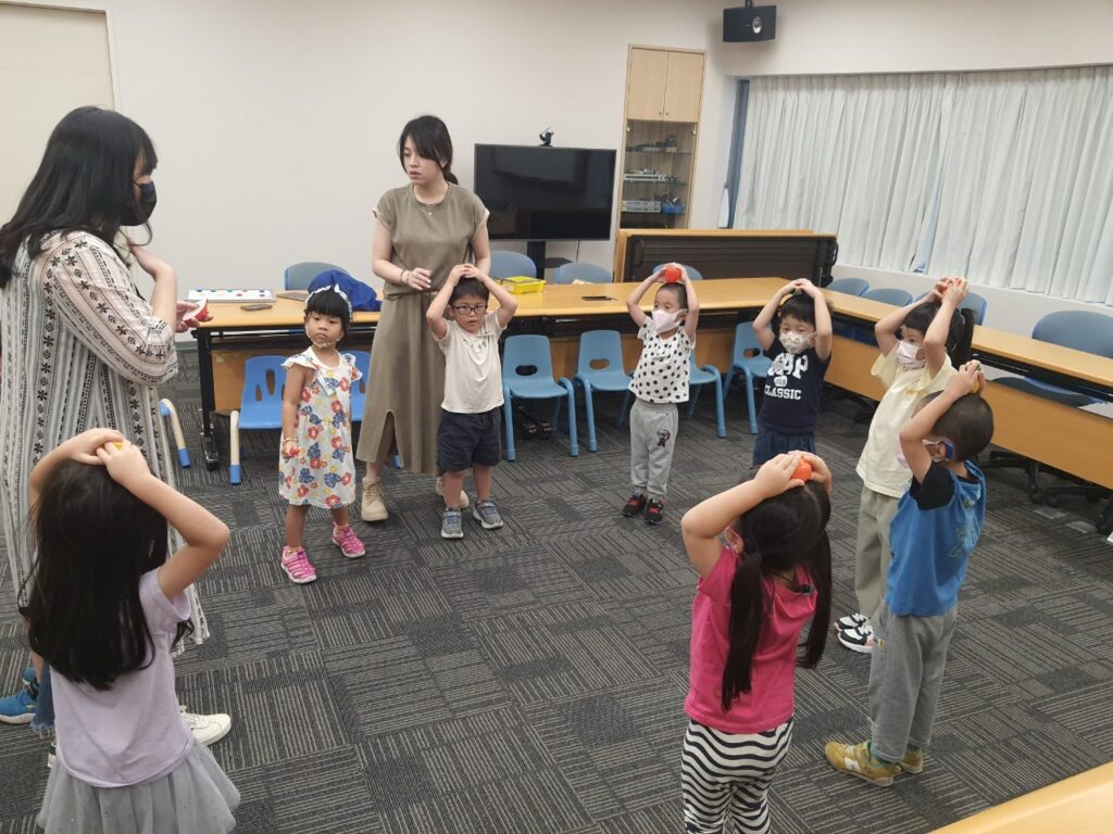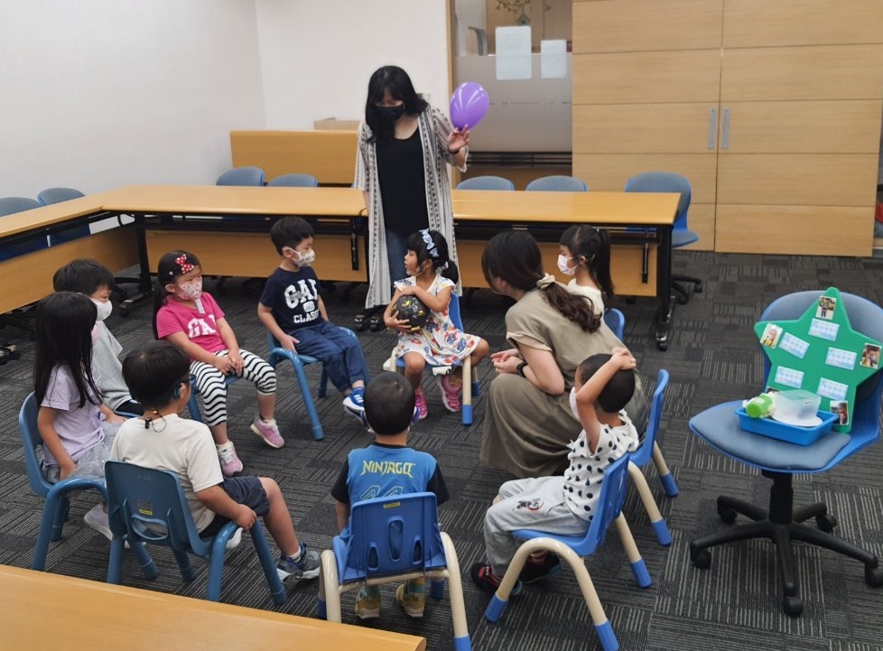 幼兒班的首次見面,聽覺口語師先透過破冰遊戲「傳遞炸彈」引導孩子認識彼此,首先請大家注意聆聽老師描述的特徵去找到該名同學,讓孩子們依序上來自我介紹,接著請每位孩子講出隔壁同儕的名字後將炸彈傳給對方,一起合作在時限內將炸彈傳回老師手中避免爆炸,孩子們雖然一開始很害羞,但都很投入在遊戲中。在暖身過後,緊接著又玩了「蘿蔔蹲」及「傳球遊戲」兩個遊戲,蘿蔔蹲中老師讓每個人抽一個蔬果擺在頭上,孩子須說出別人頭上的蔬果名稱來進行遊戲,起初大家都手忙腳亂,但後來越玩越熟練,過程中也製造了許多「笑」果。傳球遊戲則讓孩子們練習去邀請朋友,倆倆合作用廣告DM將球運送到終點的籃子,過程中觀察到孩子們會主動為彼此加油,球滾落了也會主動幫忙撿,展現出了互助合作的團隊精神。