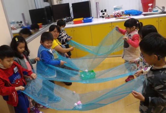 課程進入尾聲,老師請孩子幫忙收拾玩具時,有一組孩子率先合作摺布條,良好的示範作用,孩子們隨之模仿、跟進。老師為了獎勵孩子們的合作精神,並使大家都能感受共享的快樂和喜悅,請小朋友們互相發送小禮物;收到同伴手中的禮物,大家都不約而同的相視而笑,好幸福。