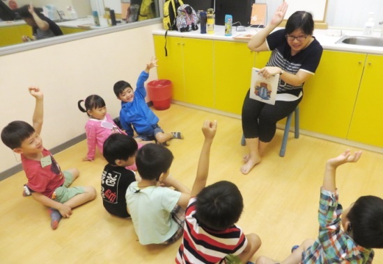 第六場課程開始,老師使用「我的感覺情緒」套書與孩子們討論平時常見的負面情緒,當老師一談論到什麼時候會「害怕」,小凱馬上說:「最害怕下大雨,因為會淹水,車子就泡水壞掉了。」,還有人毫不猶豫的說:「害怕被媽媽罵」、「害怕有鬼」。於是,老師延伸詢問孩子們害怕時,該怎麼做呢?柏柏說:「哭一下,然後找媽媽抱抱就好了。」老師帶大家練習緩和生氣的方法,大家一起跟著老師在地上打坐,大大的深呼吸,吸~吐~吸~吐~,一次、兩次、三次……,把壞心情都吐出去,好心情吸進來。最後,老師也讓孩子們畫出各種情緒臉譜,大家畫得個個表情生動,似乎已經把自己的感受投射在臉譜上了,除了透過口頭表示自己的情緒,孩子們也能運用繪畫表達出各種情緒喔!