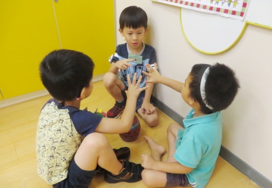 第七場次課程上課前,教室裡已經有一排各式各樣的玩具,原來今天是要透過玩玩具的過程,觀察孩子們加入他人遊戲時使用的技巧及方式的合適性,再從中引導孩子練習分享與協商。一開始有幾位孩子似乎不太懂如何加入他人遊戲,大多只靜靜的坐在旁邊看,然後再慢慢的動手一起玩玩具,彼此間對話也較少,因此老師改變分組人數與更換成員,最後更增加群體人數,於是孩子們慢慢的對話開始變多了,笑聲此起彼落,孩子們的輪替概念都很不錯,只可惜對於遊戲該由誰先誰後的決定方式,大家似乎不太能夠掌握。於是,老師在最後下課前,與大家練習以常見的「猜拳」方式,來決定遊戲的先後順序。雖然有些孩子還未能記熟猜拳的規則與如何判別輸贏,但是大家都非常的有風度,即使輸了,也能靜靜等候其他人玩玩具,展現出良好的態度。