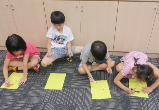 接著老師讓孩子們一一分享最近的心情,並將心情畫下來。有人分享要開學了,覺得很緊張,所以畫了一個害怕的嘴巴與扭曲的臉,也有人覺得要讀小學了,很開心可以認識新朋友,因此畫了一個大大的笑臉。每個人都畫得起勁,也很熱衷於分享。似乎大家都已經能明確地察覺與辨識自己的情緒,更能運用肢體及口語表達出來,甚至還能說出情緒產生的原因。看來大家也都越來越了解自己的情緒了喔!