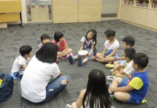 在等待第一次上課前,孩子們就發現教室地上的大巧拼,兩三個孩子把巧拼當成一格一格的格子,玩起了跳格子,吸引其他孩子加入行列,大家一點都沒有初次見面的陌生感,課程就在這樣熱鬧的氣氛開場了。雖然玩得很歡樂,但老師提醒大家,彼此都還不認識,別忘了自我介紹,也教導孩子,認識新朋友前,自我介紹的重要性。老師示範如何一邊拍打鈴鼓一邊自我介紹,在音樂氣氛帶動下,孩子們看得目不轉睛,也期待著趕快輪到自己自我介紹。孩子們大方又認真的介紹自己,一下子完成了第一次接觸。當他人在介紹時,其他孩子也人都很專心與安靜的聆聽,展現了尊重又有禮貌的態度呢!