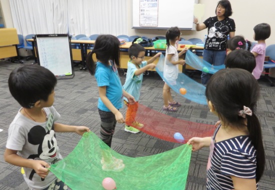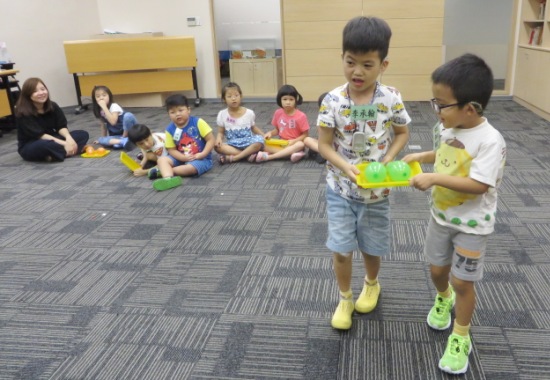 自我介紹後,老師讓大家自訂班規,以各種顏色的小熊紙牌,代表不同指令,如:紅色小熊是要安靜,黃色小熊是要坐好等…。聰明的孩子們一會兒就把老師所有的小熊指令記住,快速完成指令,更建立了良好的默契。接著老師先以兩人一組的分組遊戲──「盤子傳氣球」,在傳球過程中,大家都專注又緩慢的與隊友端著盤子把氣球傳到終點,順利得分。最後老師再讓全班分成兩大隊進行「拍球比賽」,當比賽開始時,紅布條豎起阻隔兩隊,大家把從天而降的氣球拋向對面,越少氣球的一方則獲勝。比賽開始,大家又叫又笑的,眼睛直盯氣球,奮力把球拋向對面。比賽成績揭曉,輸方未因此沮喪,反而覺得遊戲有趣,老師也讚許大家,大家在比賽中都努力的為團體爭取分數,因此大家都很棒,讓孩子們知道,比賽的過程比結果更重要喔!