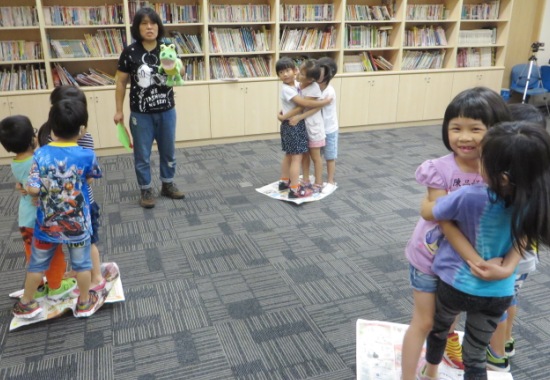 下課前,老師刻意變更活動遊戲──「躲躲大青蛙」,當大青蛙肚子餓時,每個人都要躲在報紙做成的安全島裡,才不會被青蛙吃掉,隨著青蛙越餓,報紙會越小。孩子們也透過此遊戲,不再計較一定要跟好朋友同一組,因為必須互助合作,才能躲過大青蛙的嘴巴,大家在一塊小小的報紙上緊緊相擁,保護彼此,成功躲過大青蛙,也開心的結束第二次的課程。