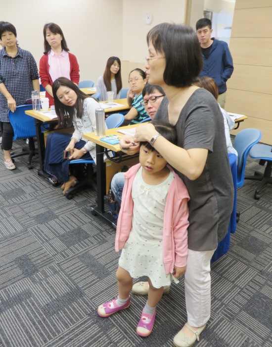 聽力師示範如何正確配戴輔具
