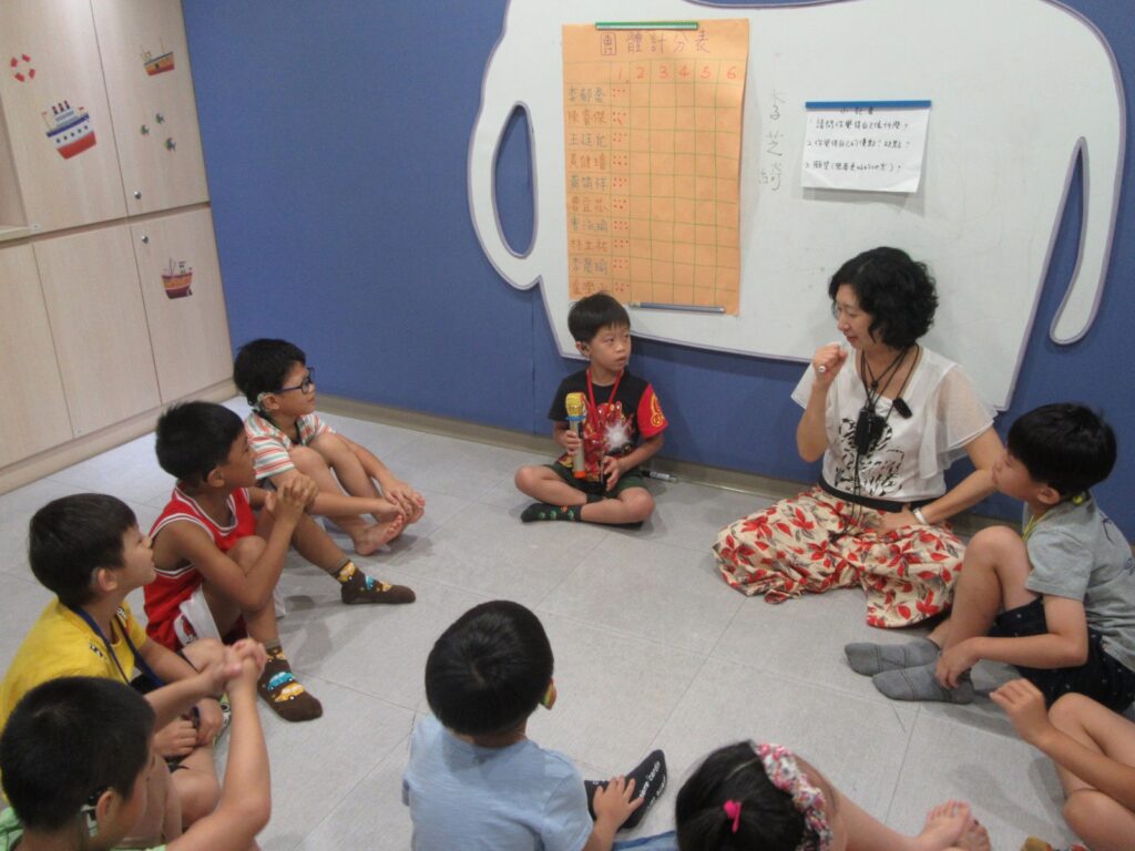 另一邊,第一堂兒童社交課程的主題為:「小記者的報導」,目標是讓新、舊同伴認識彼此,包括探索自己的優缺點、人際特質,覺察他人和自己眼中的「個人形象」差異,並練習如何大方地自我介紹。老師先請孩子們兩人一組,輪流當小記者採訪對方,藉此交流彼此的個人資訊,接著再用報導的方式與全部成員分享。採訪過程笑料百出,像是有一組成員向老師表明彼此聊得很開心,但在報導時卻無法詳細介紹對方,原來他們兩位當下都只顧著聊彼此都喜愛的「跑車」,忘記要了解對方的基本資訊了!還有一組成員問不到對方的優點,是因自覺在他人眼中,自己沒有任何會被肯定的地方。孩子們也在學習報導的過程中,慢慢掌握和理解抽象的「自我特質」,並學習修正介紹他人的方式,慢慢建立起相處的默契。