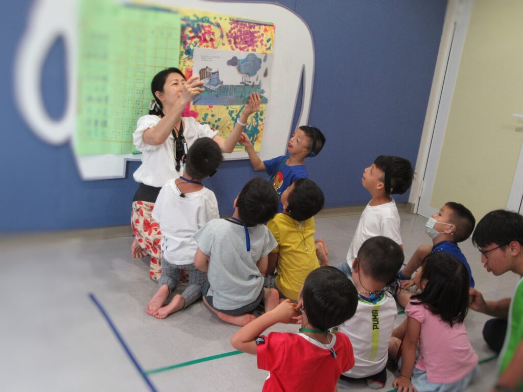 待孩子們對情緒有了基本的認識後,老師便接著進入第二階段,透過繪本共讀來揣摩不同的情緒反應。孩子們對繪本都很感興趣,很快就能將自我投射在書中主角身上,除了建立情緒分類的概念外,還連結了色彩與不同情緒的心理感受。譬如「傷心」是灰藍色的雨滴、「平靜」則像平躺在草原上一樣放鬆,是綠色的樣子。下課前,老師引導孩子們在體驗不同情緒之後,好好放鬆、沉澱自己,作為今天情緒探索課程的結束。