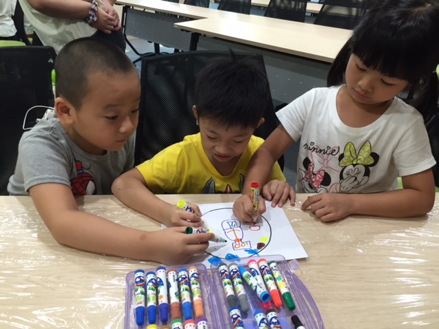 在構思設計圖的過程中,同組的小朋友們彼此間熱絡地討論,並運用「適當表達同意」的溝通策略來達成組員間的共識,一起協力完成設計圖;有的組別因為大家沒有分配好要畫的區域而發生衝突,透過兩位老師在一旁的示範與提點,小朋友們最終都了解並願意嘗試運用不同的溝通方式來解決問題。在設計圖繪製完成後,老師請各組都推派一到兩位小朋友上台分享,小朋友們一改之前上第一堂社交課時的畏縮態度,紛紛大方地上台介紹自己這組的創作,也在介紹完畢後博得滿堂喝采。