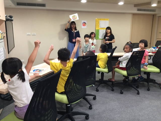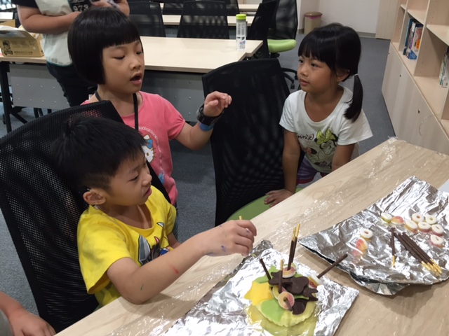 小朋友們在和自己的組員討論過後,紛紛決定要推派出某幾位代表向別組借用材料,而除了溫和有禮地提出請求外,也有小朋友聰明地想出了「交換材料」的好點子,讓整個湊齊材料並裝飾蛋糕的過程充滿了歡聲笑語,每一位參與課程的孩子都十分認真投入,大家攜手一起將設計圖上的蛋糕設計付諸實行,並在完成後和其他小組分享自己的蛋糕作品,享受了認真勞作後的甜美果實!