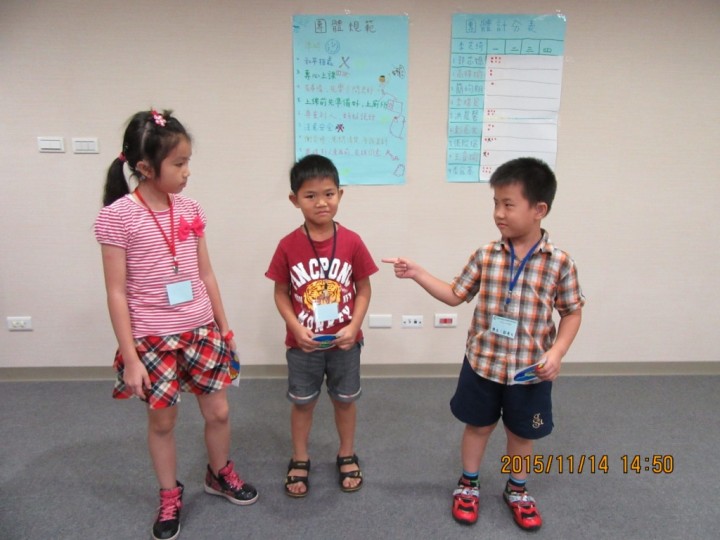 在設計圖繪製完成後,老師請各組推派一到兩位小朋友上台分享設計圖,小朋友們一改之前上第一堂社交課時的畏縮態度,紛紛都大方地上台介紹自己組的創意想法,也在介紹完畢後,博得了滿堂喝采。