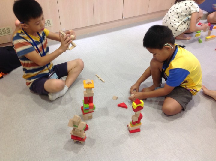 第二個課程活動是「互助互信」,老師以孩子們喜愛的積木拼組遊戲來設計一系列的小組競賽活動,從一開始合作執行簡單的指令(將所有的積木疊到最高),到最後各組共同完成一項積木創作,老師發現有些小組雖已事先討論好工作的分配或創作的主題,但在實際操作的過程中,仍有孩子不滿意自己被分配到的工作或已決定好的作品主題,且直接將不愉快的情緒表現出來;老師也藉此帶領孩子們一同討論解決意見分歧的方式,孩子們開始嘗試「說出自己的想法」及「傾聽別人的感受」,原本緊繃的氣氛也漸漸地和緩下來,孩子們更開始你一言、我一語地重新討論創作主題,接著等競賽時間一到,孩子們皆興奮地分享著屬於他們一起完成的作品,有「公主城堡」、「動物農莊」、「101鐵塔」,甚至還有「磁浮列車」呢!