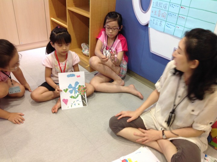 在揮灑完自己獨一無二的創作後,接著來到了團體分享時間。孩子們紛紛說出自己的創作靈感,並相互給予不同的回饋,讓彼此能從他人的意見中得到寶貴的回饋。