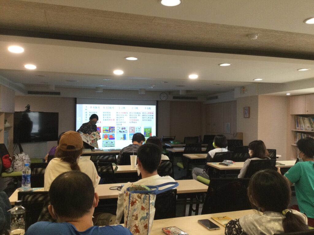 講座一開始,老師快速地和家長介紹主題與大綱,和家長們一同學習在這麼多的書中,分辨哪些書是繪本,當我們找到繪本後則須篩選出不同年齡適合的書。接著,和家長們討論共讀的技巧、好處、要素及經驗,許多孩子讓家長在共讀時吃盡苦頭,例如:不專心、不斷翻頁、撕書等等,從環境的布置、時間的選擇到共讀的小撇步,讓家長重拾信心與希望,家長分享回家後可以試試看新的共讀策略,期待孩子喜歡親子共讀繪本的時光。