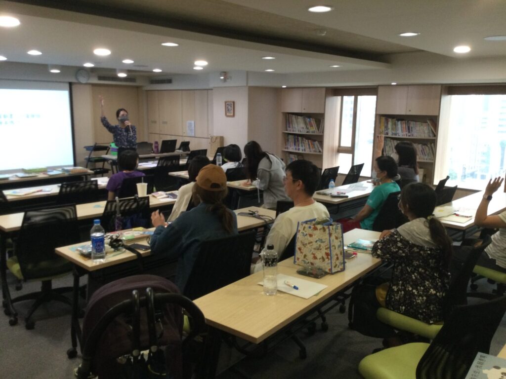 講座下半場,老師邀請每位家長挑書、設計教案、上台教學演練,家長們在準備教學的過程中,老師觀察到家長們能相互分享如何選書及設計教案,還有家長積極地和老師討論孩子現在所學習的目標及繪本運用方法。團體中無論是教導聽損兒年資較長或較短的家長,都能給予彼此在教學上的建議及想法,藉由家長們踴躍地分享著使用繪本教學的經驗、陪伴孩子成長的經歷,相信繪本教學在家長心裡留下了更深刻的印象。