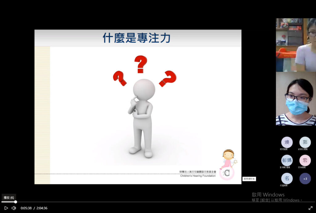 說明了「不同年齡層兒童專注力的持續時間」,以及提醒家長們「影響專注力的因素有哪些」後,進入第一個討論主題:五感專注力,五感包含了視覺、聽覺、觸覺、味覺和嗅覺,老師先從每一種感官舉出生活中相關活動實例,如何結合聽覺口語法練習,並給家長們五分鐘的時間動動腦,在運用不同感官時,生活中有什麼教材或活動可以提升孩子的專注力。到了分享時間,請家長們輪流開啟視訊鏡頭和麥克風分享自己的小活動,每位家長有想出一種感官的專注力活動!彼此分享自己在家中可以使用的教材和活動方式。