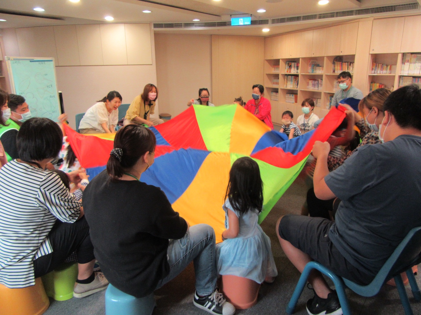 接下來,運用氣球傘的活動創造出大團體的互動機會,有些孩子較為開放,可以獨自自由進出傘底下的空間,有一、兩位孩子會比較猶疑不敢投入;以肢體表達出數字的身體遊戲,可以發現孩子和家長們有趣的創意身體連結。