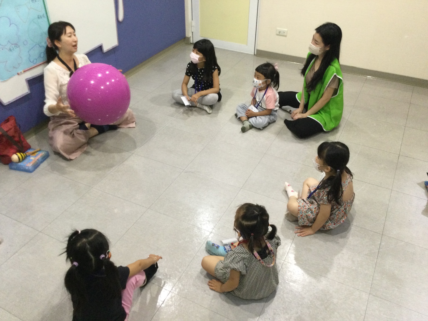 兒童團體第一階段「認識我」,以樂器模仿動作、發聲來介紹自己,小朋友們顯得很陌生而不敢開口,只能揮舞著小手與樂器。在加入音樂後,有少許成員能漸漸地跟著唱,但仍難活絡放鬆,此時老師改以大球促進成員間的暖身,鼓勵孩子們自發的口語來表達傳接球,孩子們因高度動機而主動進行,有孩子難以口語說話,但不斷以動作跳前跳後來表達心中的渴望與起伏的情緒,也有孩子以領導者自居,會主動幫忙送球給需要的成員。老師除了觀察到團體裡不同的溝通方式與角色選擇之外,也看到孩子展現動態的層面,譬如嘗試用力拍球、彈球的挑戰,像是信任團體的承載,確認自我的能力界限,也像在尋找相似特性的朋友,一起玩耍的邀約,小朋友的社交模式就在這些探索中開展。