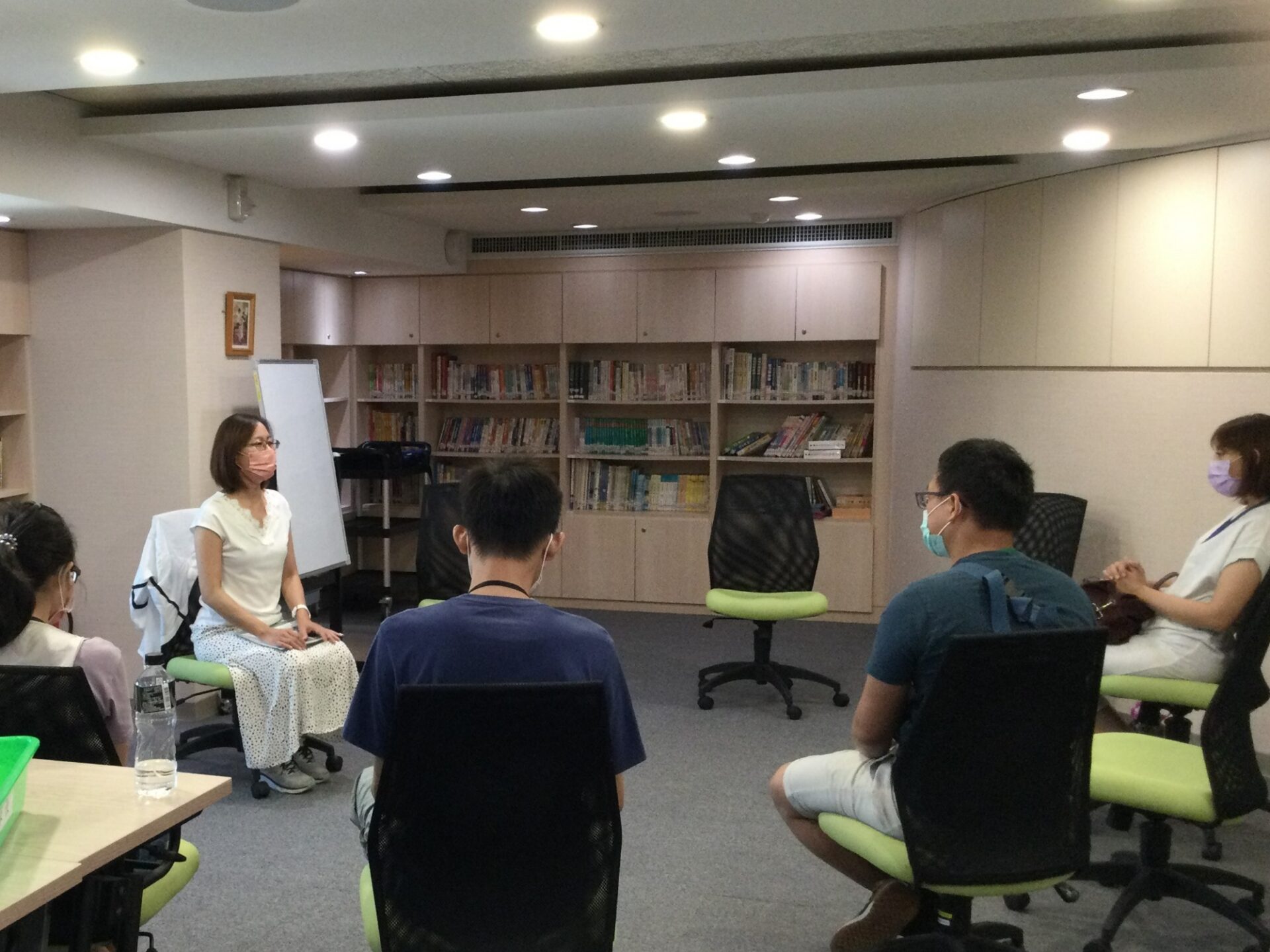 另一邊家長團體課程主題為「什麼是剛剛好的母親?」,探索和反思日常生活中家長本身是如何照顧孩子的呢?例如:無微不至、適度放手、自由放任、隔代教養,並學習關照和接納自己和孩子的不足,在照顧家人與照顧自己之間取得一個平衡的關係。一開始大家即自然地展開畫匣子,討論著與孩子有關的事,藉此引導大家思考如何是個「剛剛好」的家長。接著,聊到如何在家庭和工作之間取得平衡,獲得緩衝喘息的空間,不讓自己過於陷落在疲倦憂鬱的狀態,或許每個人可以調整的程度不一狀況不同,但可以有機會反思和被同理支持,是這個團體課程可以給予的。